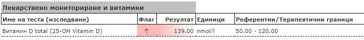 В рамките на около месец приемах по около 8000 ед. на ден (8 впръсквания),  изчаках 2 седмици да минат (през това време бях и на море) и сега на контролния резултат излезе това, резултат 139, интересното е и че и калцият ми е малко над норма, доколкото виждам са свързани. Може ли съвет как да продължа да го приемам, никога не бях приемала вит Д и може би се изсилих.. на сегашния резултат са ми странни и високите реф.стойности, имаш ли представа дали може да са различни.