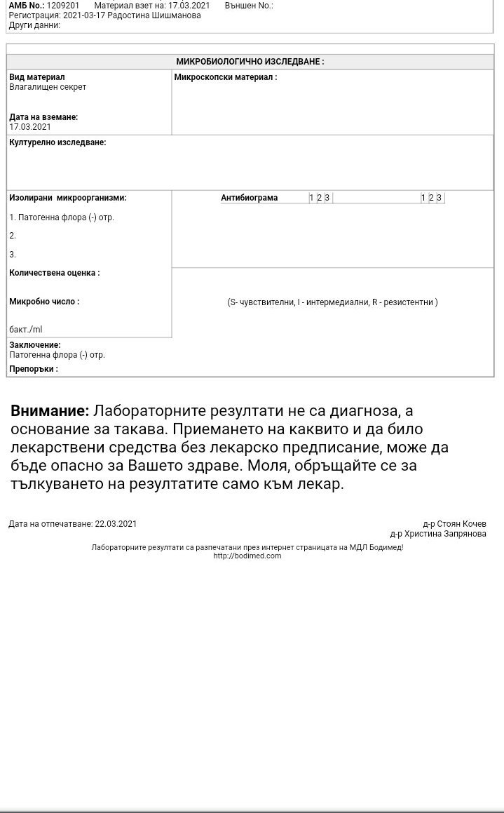 Здравейте! Миналата седмица докторът ме записа на ЖК и ми даде съответните направления, като ми взе секрет за микробиология и цитонамазка. Още същия ден оставих пробите в Бодимед в Пловдив, като за цитонамазката си ми казаха, че ще излезе тази седмица, днес няма нищо още, но предполагам до 1-2 дена трябва да има резултат. Обаче микробиологията още от петък ми стои така, ама това не ми се струва пълен резултат. Така ли трябва да изглежда и да не ми като е  с направление да изследват по-отрязано.. прилагам снимка на излезлия резултат към този момент. На 17.03 оставих материала.