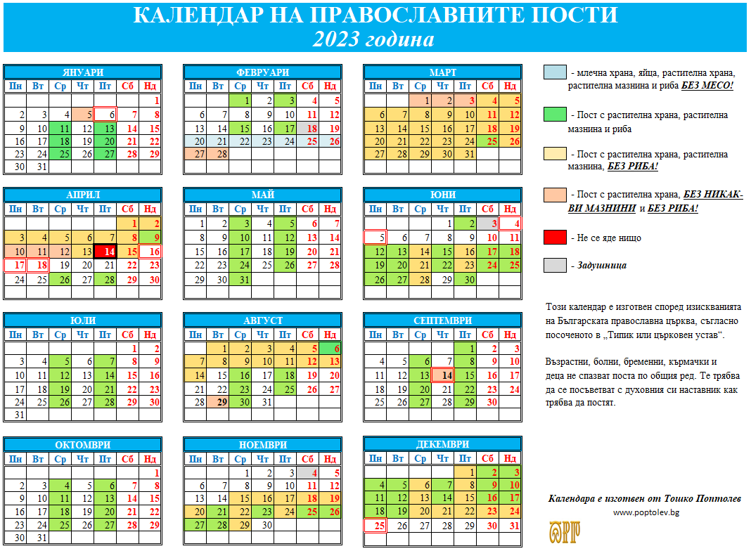 Календара който съм дал е изготвен в пълно съответствие с изискванията на устава на БПЦ (Типик). Постите не означават гладуване или хранителен режим, но това е тема, която многократно е дискутирана тук и не намирам пово още един път да я почвам. За квалификацията „глупости“ ще си замълча, защото за разлика от вас, аз съм в пост и се въздържам да отговарям подобаващо.