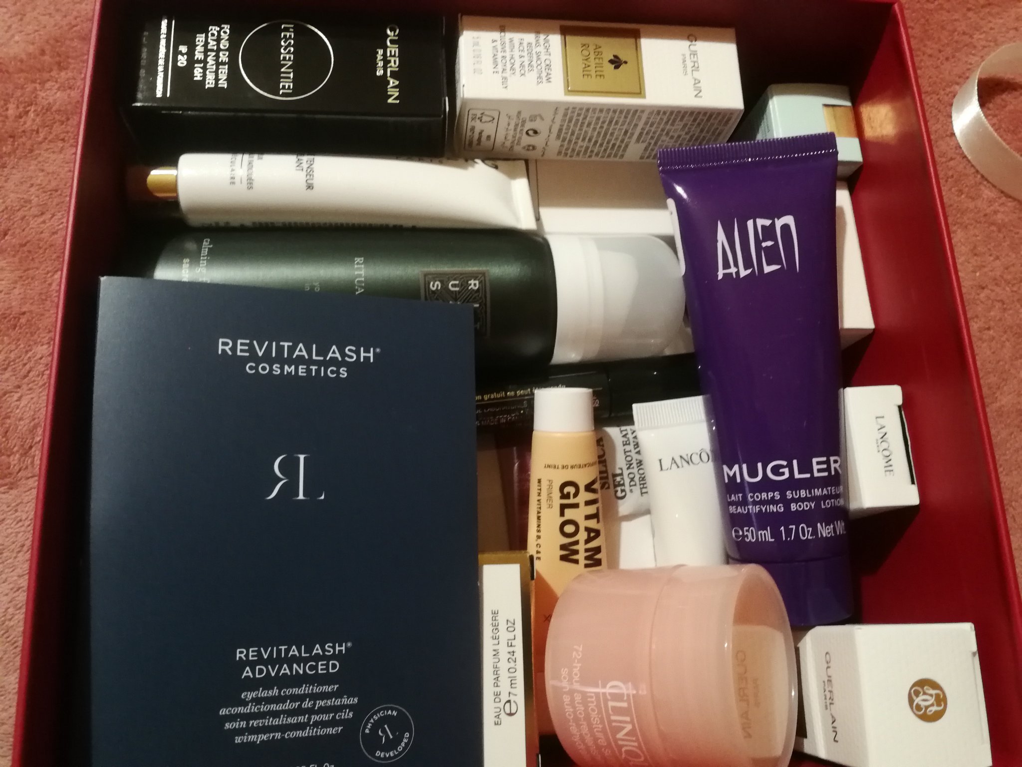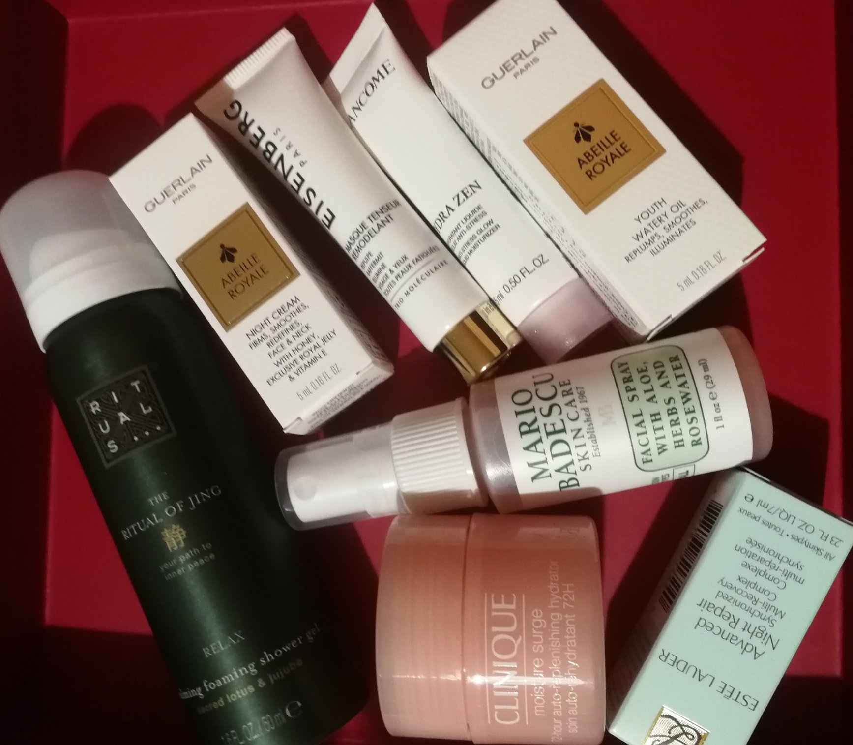 Кутия с травъл опаковки на кремове и маски, грим продукти - сенки, спирали, червила, глосове, хайлайтър (някои от тях пълноразмерни), и минита на няколко парфюма. Получават се в магазина, който си посочил в отговор на изпратен в началото на декември мейл от клиентски отдел на Дъглас. Нямат общо с натрупаните точки. Те се ползват отделно до 31.12. Предполагам, че подаръците са за клиенти с оборот в над определена сума.