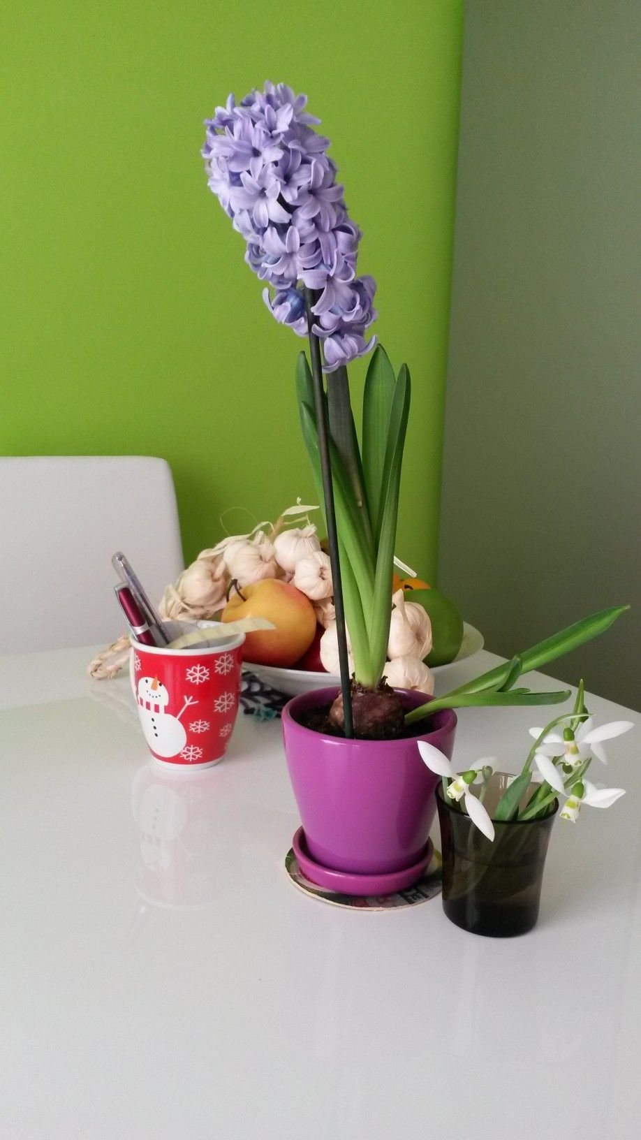 Холокухнята ни е в бяло и зелено, бяла кухня със сив плот и гръб, дивана ни е сив, с римски щори сме , на снимката се вижда част от тях.