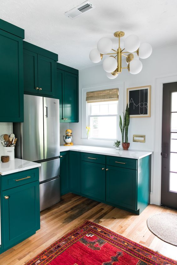 Харесва ми комбинацията на зелената кухня.
