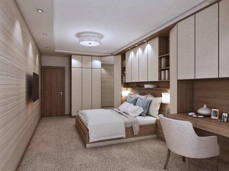 Ако имате възможност за поръчка, вариант 1 ще даде повече възможности за свързване на гардероба, леглото и бюрото, включително и с надстройка. Така хем ще имате максимално място за съхранение, ъглов гардероб и много шкафове, хем и просторът ще се запази.