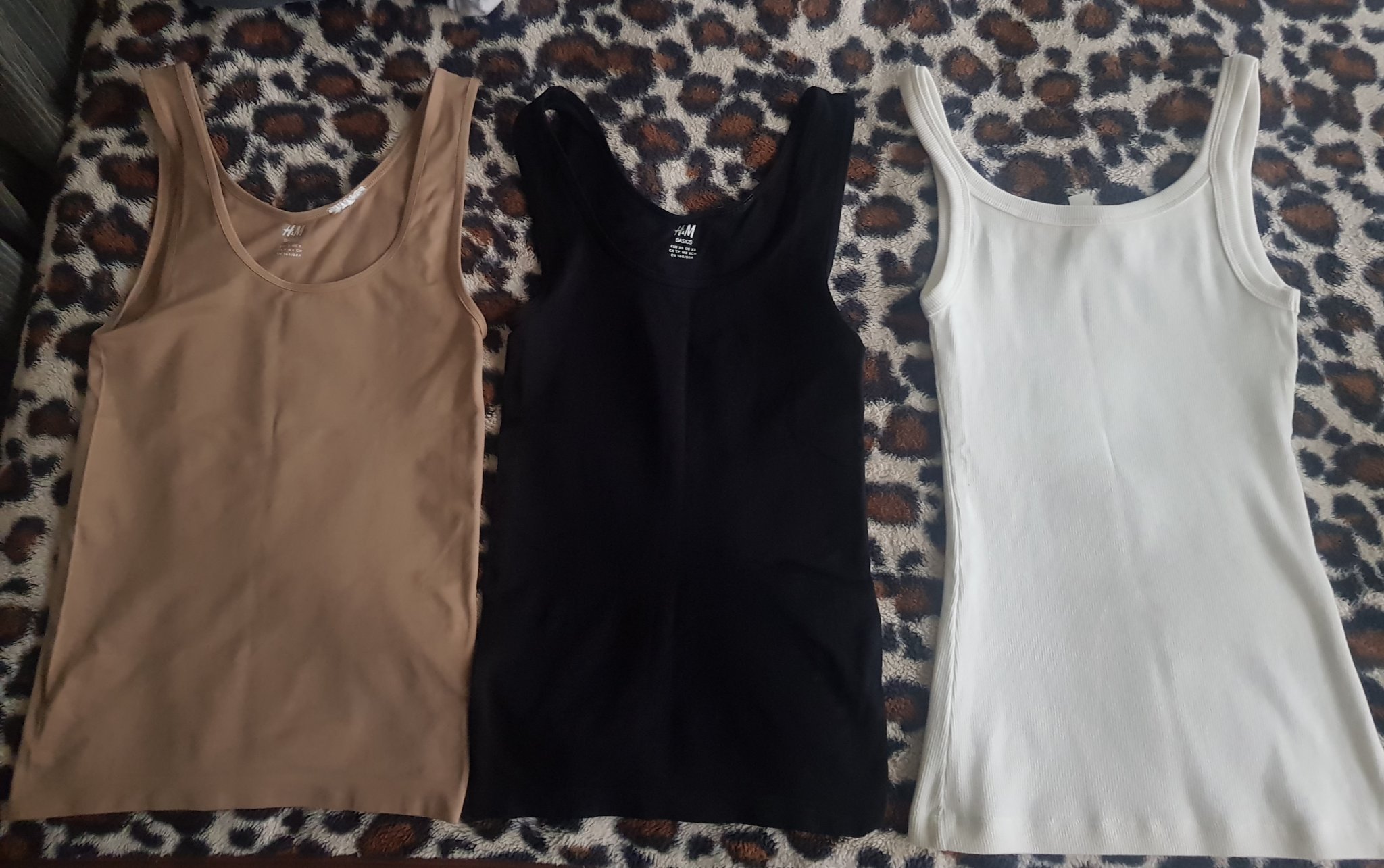 Белият е от basic серията, рипсено трико, страхотен ХС. Дано не стане чувал или да се свие като го изпера 😏