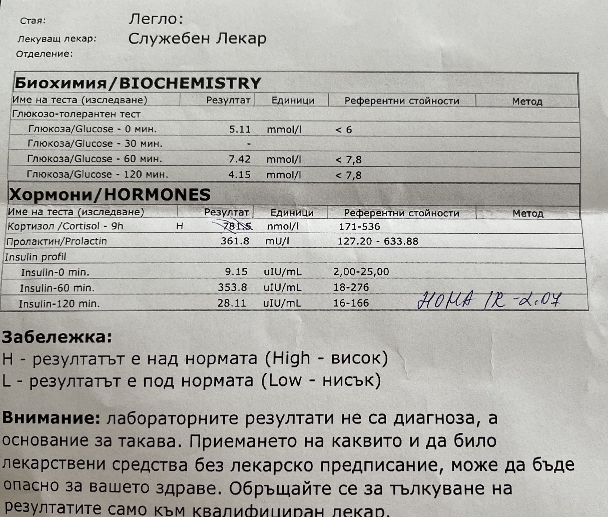 Това защото хома индекса ми е 2.07. Ще ми е интересно да чуя вашето мнение. Истината е, че след като изпих глюкозата имах чувството, че ще умра. Наистина. От както правих изследването почнах да се храня нисковъглехидратно, не съм прегрешавала с нищо, освен с две парчета козунак по Великден, ама цял ден го правих и не можах да устискам да пробвам какво съм сътворила. Ендокриноложката ми прави измервания с един уред, според който имам да свалям още 8 кг и да кача мускулна маса. Напълняването ми е основно в корема и ханша. Тя каза, че одобрява фастовете, кисело мляко каза, че мога да ям след като аз си го квася. Прясно не консумирам понеже ми става много зле на стомаха. За фастовете каза, че е много за, и че не мога да издържам повече време заради инсулина.  Става ми ужасно лошо. Най-голям проблем имам със стомаха обаче, от както почнах режимно хранене съм адски запечена. Пробвах и с хуск, никакъв ефект. Направо съм се отчаяла. Прикачам си резултатите. Отделно четох в чуждестранни публикации, че Хома индекс над 1.9 те го считат за ИР.