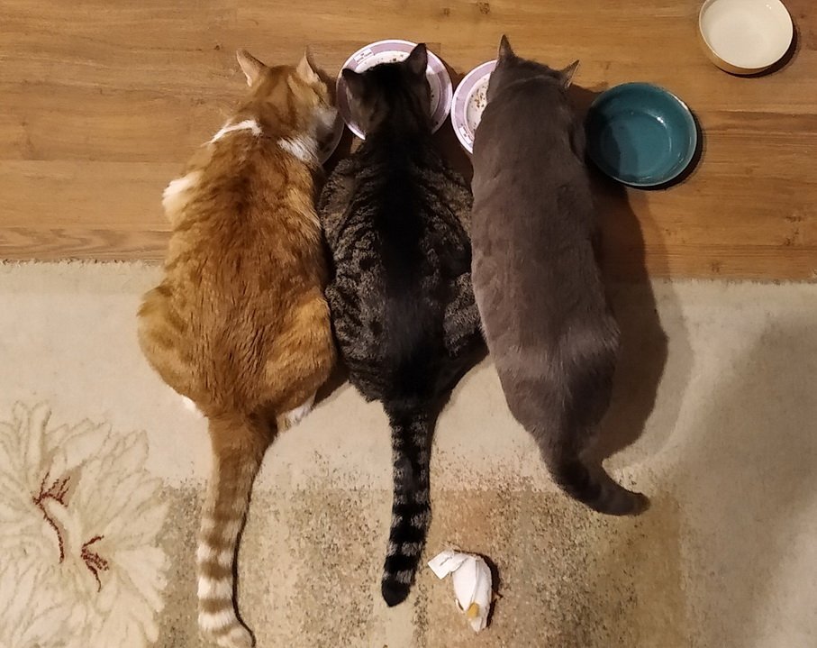 Снощи, без да се усетя, съм сложила "мъжките" купички много близо една до друга. Сипах храна, сложих малко по-нататък на дамите, защото така по-малко ги гонят и едва тогава ги погледнах как са се наредили плътно един до друг, за да си стигнат купичките. Joy  Хубаво, че наблизо имах телефон, че да ги снимам. За качеството на китайския телефон не ми се говори, но пък гледката беше ... Joy