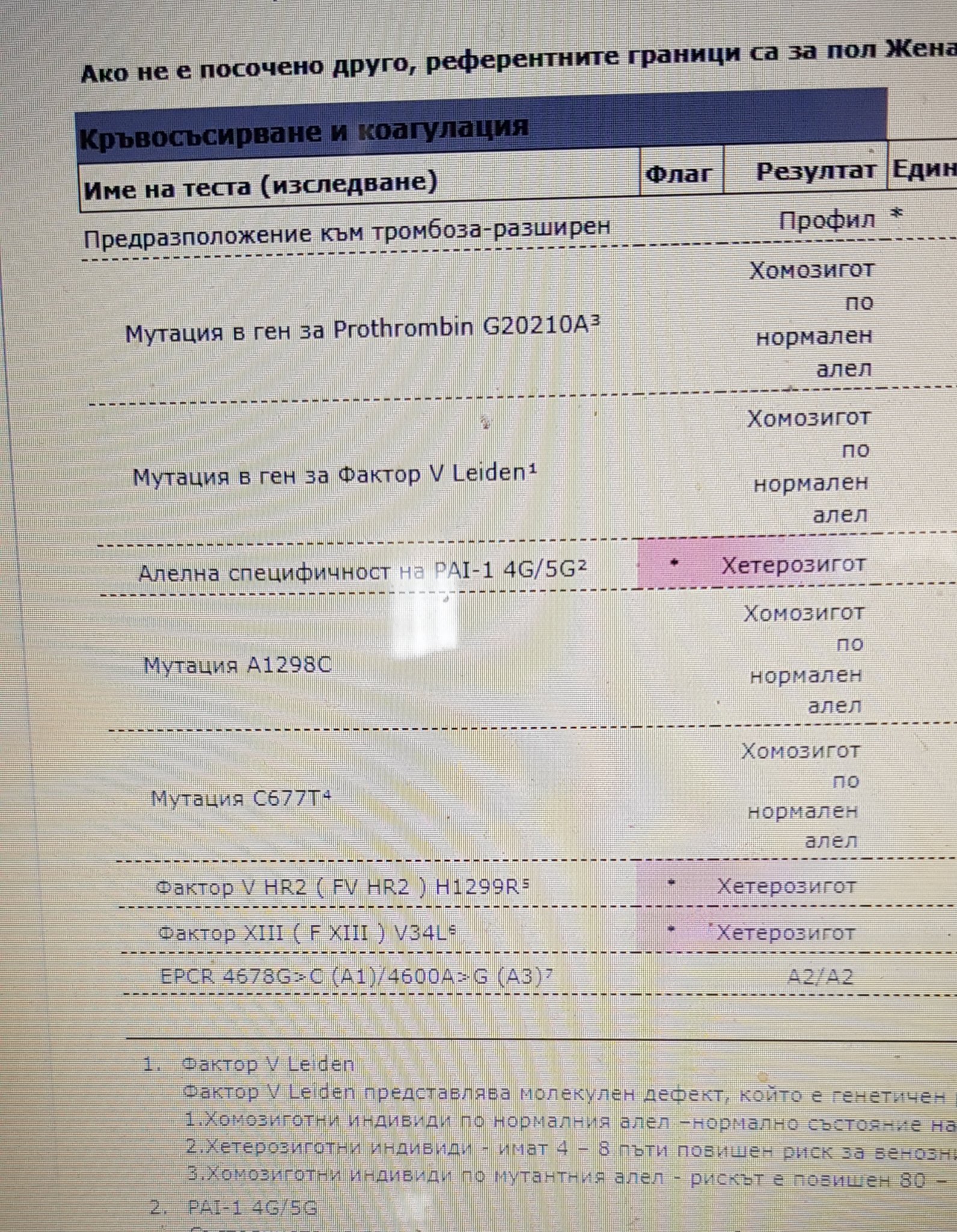 Аз все пак на своя глава си пуснах изследване за тромбофилия. По-запознатите може ли да ми разчетат резултатите, че не ми изглеждат добре, а съм на преглед чак на 15.04 и мн се притеснявам 😥