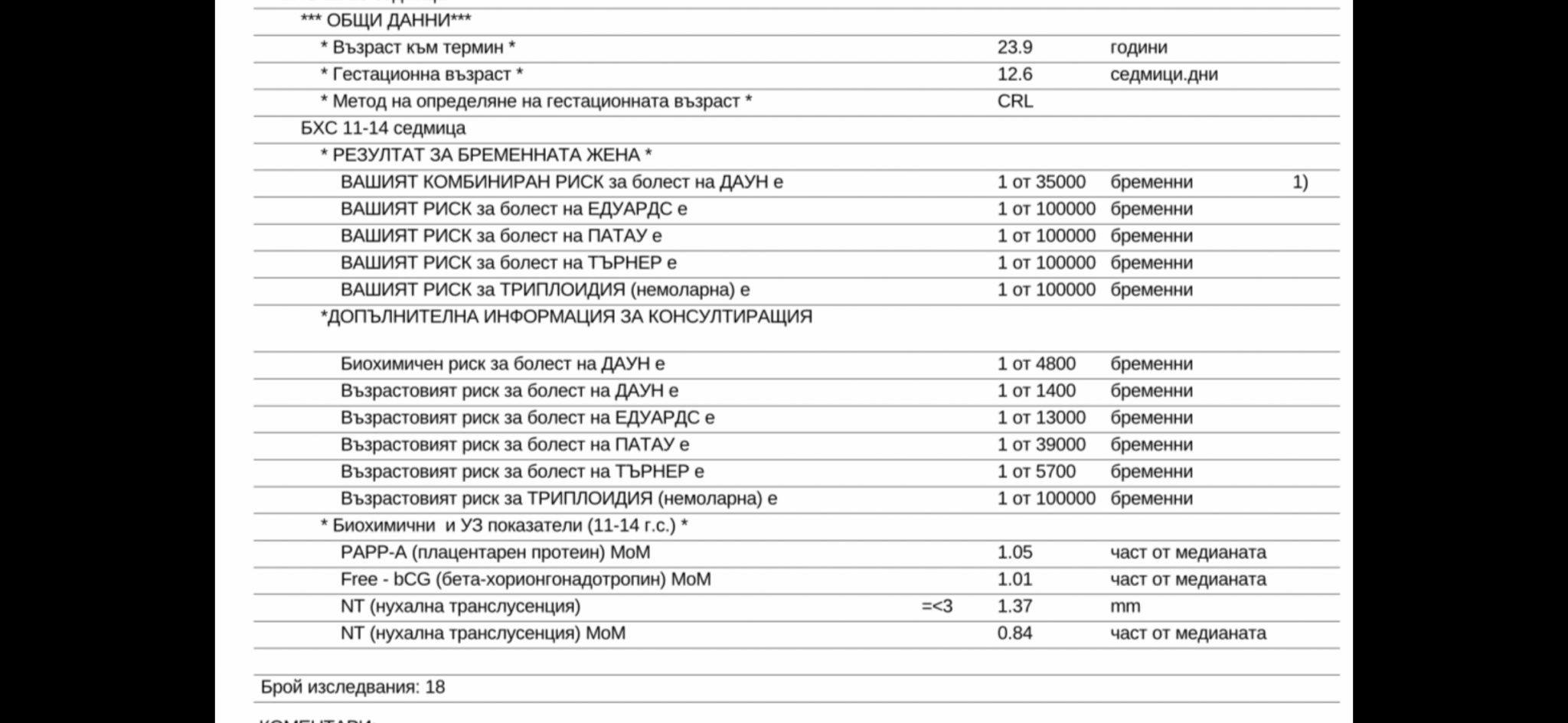 Добър вечер и от мен. Резултата от БХС ми излезе днес, пробата я взеха вчера във МЦ Фемина и след това са я занесли в МД, просто ме изненада колко бързо стана, очаквах да е готов към петък. Момичетата, които са във Фемина може да го имат предвид. В събота очаквам обаждане от генетик да ги обсъдим. Ако няма да досадя много искам да ги пусна и тук, момичетата дето разбират да хвърлят по едно мнение, защото до събота ще го мисля само, а нищичко не разбирам, но единия резултат е 1:1400, което ми се струва малко..