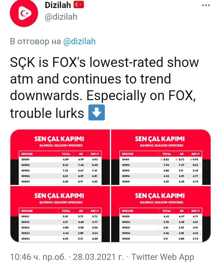 Не знам как ще снимат лятото с такъв рейтинг при толкова сериали на FOX. Не им понася любовта на турците и това е...
