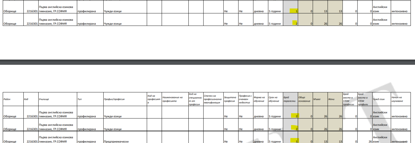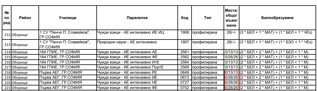 Гледах сега план-приема за София - за езиковите гимназии ми прави впечатление, че повечето имат същия прием като миналата година, но Първа АЕГ са заявили 8 паралелки при 4 миналата година. Чудя се дали е възможно или е грешка в проекта за тази година. Испанската гимназия също са с 6 паралелки тази година срещу 5 миналата. Обаче в 31 СУЧЕМ едната английска паралелка е станала математическа - миналата година имаха 2 АЕ, 1 НЕ, 1 ИЕ и 1 МАТ, сега са пак 5 класа, но вече 1 АЕ, а 2 МАТ. Сравнявам проекта за тази година http://ruo-sofia-grad.com/wp-content/uploads/2021/03/proekt_DPP_ … dnevna_dualna.pdf с данните за миналата година в прил. 3 тук https://karierno-orientirane.com/%d1%81%d0%bf%d1%80%d0%b0%d0%b2% … 7-%d0%ba%d0%bb-2/