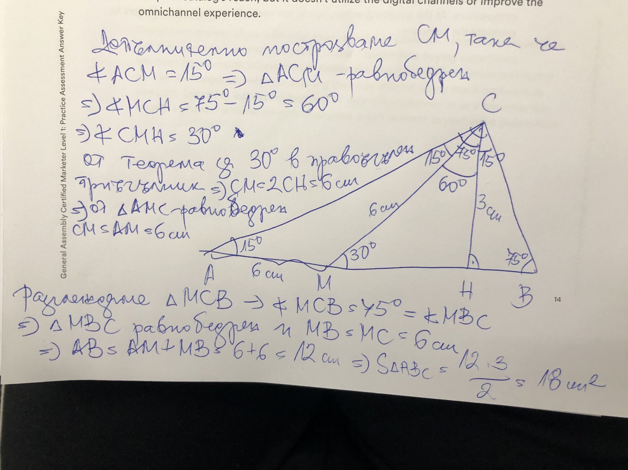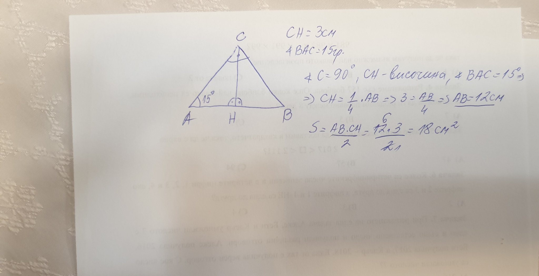 Даден е правоъгълен триъгълник (ъгъл С=90°). Ако височината СН е 3 см и ъгъл БАС=15°, намерете лицето на триъгълника.