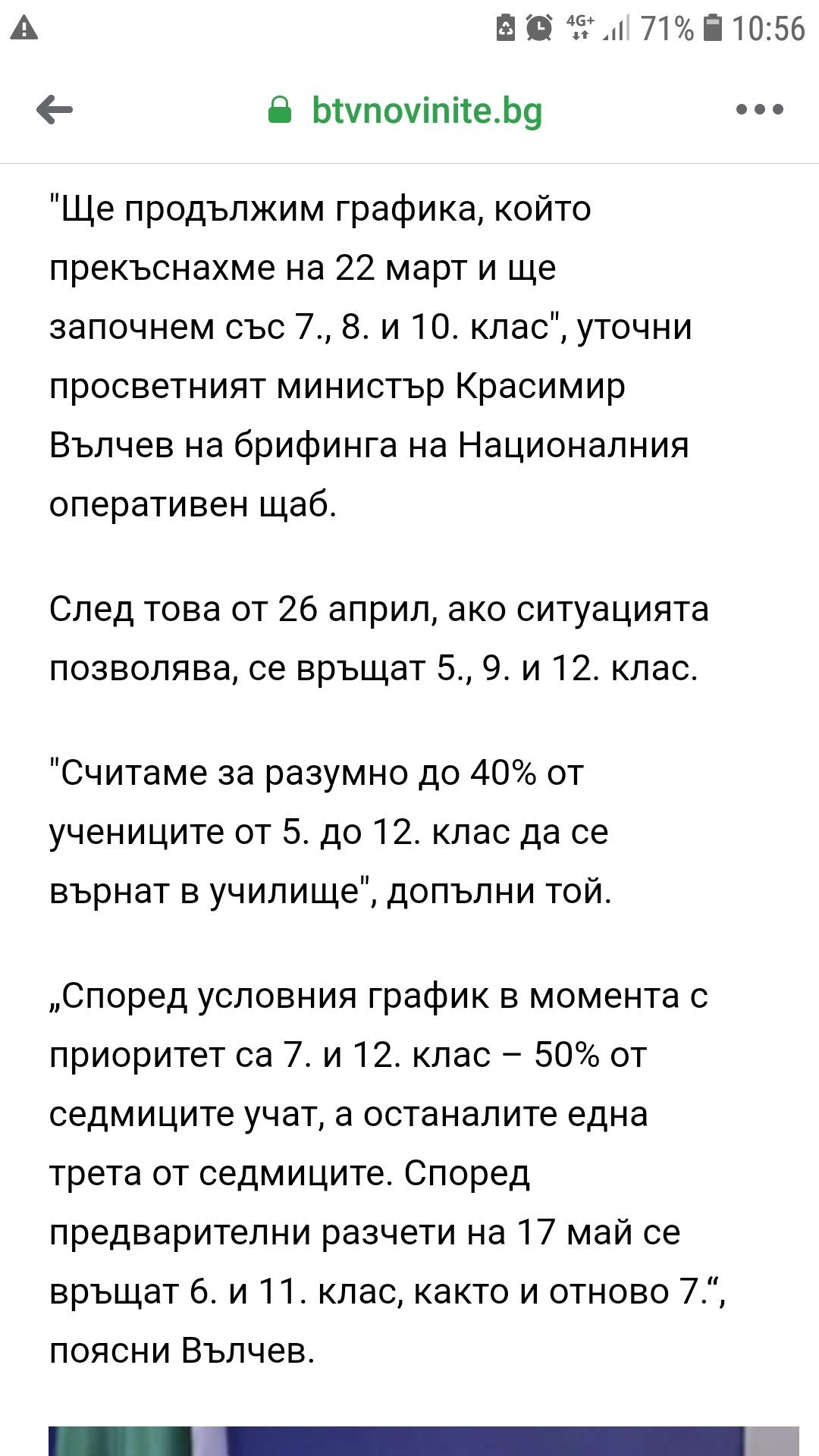 В началото на тази година той всъщност беше за локален подход по училища (да си избират дали са ПО или ДО, понеже има училища с достатъчно стаи и входове, малки населени места или частни училища с малки класове) и през окт издаде такава заповед, която беше надцакана на следващия ден от здравния министър и се влезе в ДО за цялата страна едновременно. Сега обаче вече не знам кой какво мисли, защото според мен те едно си мислят, а друго ги карат да говорят в пред/след изборна обстановка. Не разбирам иначе как и защо един лекар би разхлабил мерките с болни, повече отколкото в момента на затягане, нито пък разбирам защо винаги решенията за учениците  идват в 12 без 5 и без смислена аргументация - кога кой ще е ПО/ДО, кога ще са ваканциите. Та и това за материала в НВО още даже не е предпоследно.
