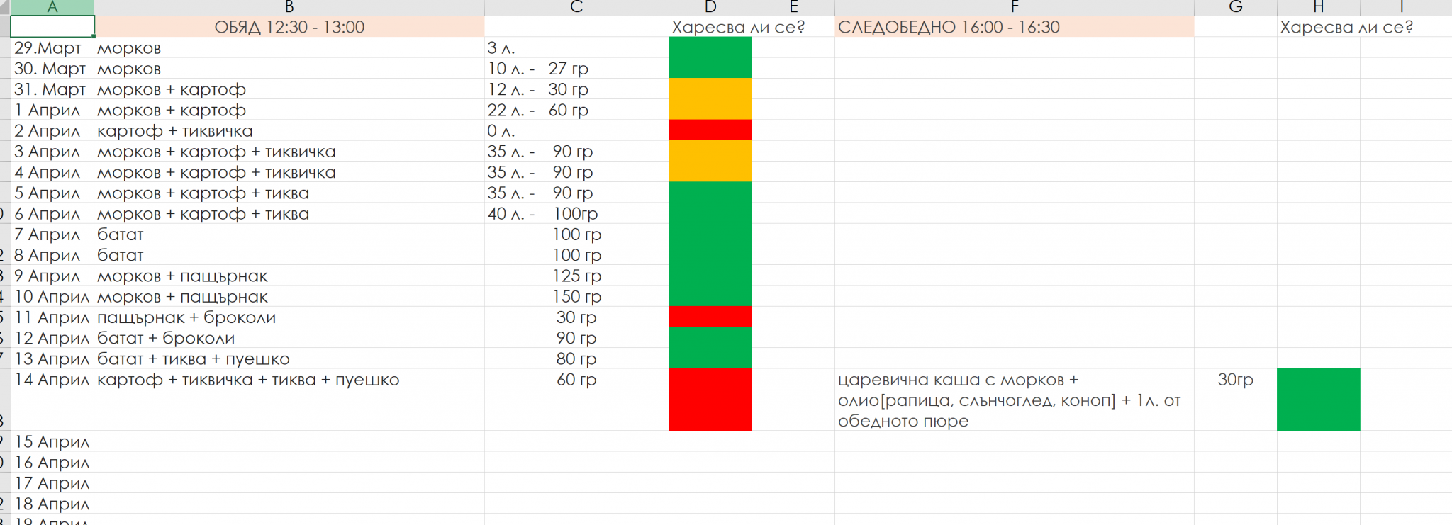 Започнах с 2 лъжички тиква. На втория ден не прие нито една. Ден 3 - 2 лъжички батат. Следващия ден - 6-7 лъжички. После към него добавих 4-5 лъжички тиква(не беше проявил никаква друга реакция към тиквата, освен ненавист Joy). После към пюрето, добавих 3 лъжички картоф. По този начин вкарах пащърнак, бял морков, броколи и морков - към смес от вече вкарани зеленчуци 3 дни добавя друг зеленчук. В края на трета седмица дадох многокомпонентни пюрета, чрез които беше едновременно захранен с 2-3 нови зеленчука (примерно пюре съставено от картоф, морков, грах (10%, зелен боб - 6%, червена чушка - 5%).