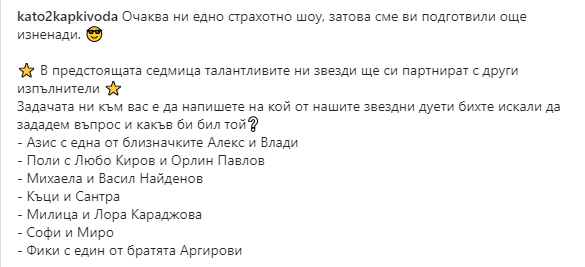 Въпросът не е да поканят тези, които са се съгласили или тези, които няма какво да правят. Въпросът е да поканят можещи и хора, които стават за този формат. Уверена съм, че в България има много актьори, които биха се справили милион пъти по-добре и от Азис, и от Софка, да не говорим за Поли, Михаела и други няма да споменавам. Но... Магърдич има дефекта /вече го виждам мноооооооооооого ясно/ да наема тези, които са му приближени по една или друга линия. И продукцията върви надолу, надолу, надолууууууууууу...