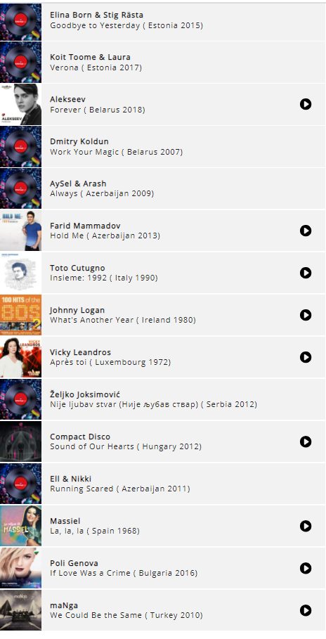 Както и да е, пускам ви линк, на който можете да гласувате за вашите 15 любими песни за всички времена от Евровизия, те са над 1000 песни.