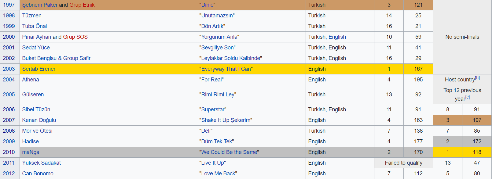 Не, доста успешни им бяха песните. Особено след 2002... Бяха поне 5 пъти в Топ 5, веднъж спечелиха, бяха и на второ, и на трето, и на четвърто място.  Двете чалги... на Сертаб и на Хадисе бяха класирани най-добре. Също и на рок групите Манга, Атена, Мор ве Öтеси.   Само последното им участие .. на Джан Бономо беше гола вода. Трябва да намеря таблица и ще ти покажа, не ми се рови сега. Но ги помня.. а и доста пъти гласувах за тях, тия рок групите са супер. А Кенан Доулу изпревари през 2007 Елица и Стунджи с 4 точки и се класира на четвърто място