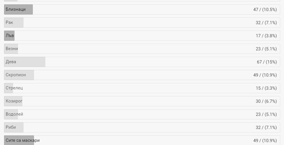 Защото принципно имаме право само на три отговора, а Близнаци са ми просто неприятни, не и личен опит, сега бих гласувала така:
