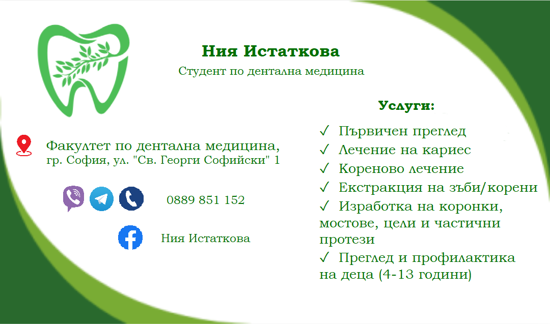 Студентите по дентална медицина предоставят различни услуги като безплатни прегледи, лечение на зъбен кариес, кореново лечение, изваждане на зъби, изработка на протези, почистване на зъбен камък и други. Всички манипулации се извършват под наблюдението на специалисти и при спазване на противоепидемичните мерки. Студентите по дентална медицина предоставят различни услуги, включително безплатни прегледи и лечение на зъбен кариес, кореново лечение, вадене на зъби, изработка на коронки и мостове, както и поставяне на протези. Услугите за деца, обикновено до 18 години, са безплатни или на символични цени и се извършват под наблюдението на квалифицирани преподаватели.