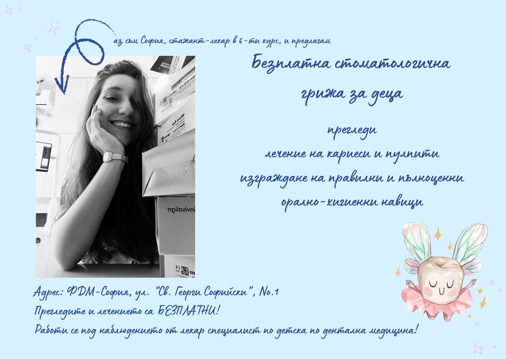 Студентите по дентална медицина предоставят различни услуги като безплатни прегледи, лечение на зъбен кариес, кореново лечение, изваждане на зъби, изработка на протези, почистване на зъбен камък и други. Всички манипулации се извършват под наблюдението на специалисти и при спазване на противоепидемичните мерки. Студентите по дентална медицина предоставят различни услуги, включително безплатни прегледи и лечение на зъбен кариес, кореново лечение, вадене на зъби, изработка на коронки и мостове, както и поставяне на протези. Услугите за деца, обикновено до 18 години, са безплатни или на символични цени и се извършват под наблюдението на квалифицирани преподаватели.