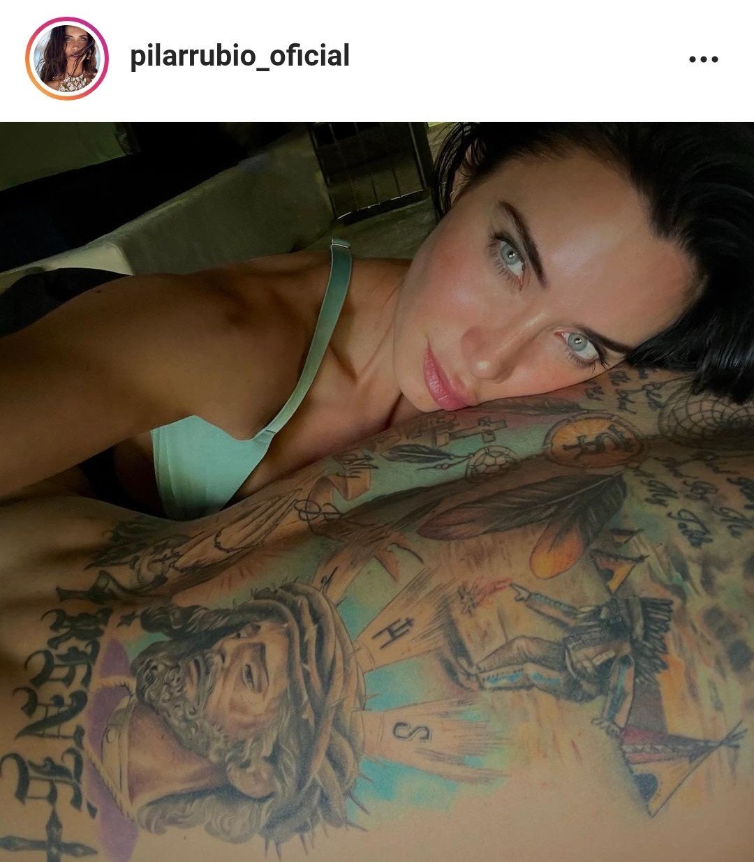 Пилар Рубио, уникално красиви очи, които цветово се връзват с татуировките на мъжа й (първоначално го взех тоя гръб за шарени чаршафи 😀)