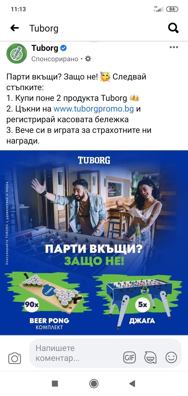 90 броя beer pong комплекта - Участникът трябва да регистрира поне 1 (един) касов бон, с минимум две закупени опаковки бира Tuborg, за да има 1 валидно участие в томболата за beer pong комплект. Наградата се печели в момента на регистрация.