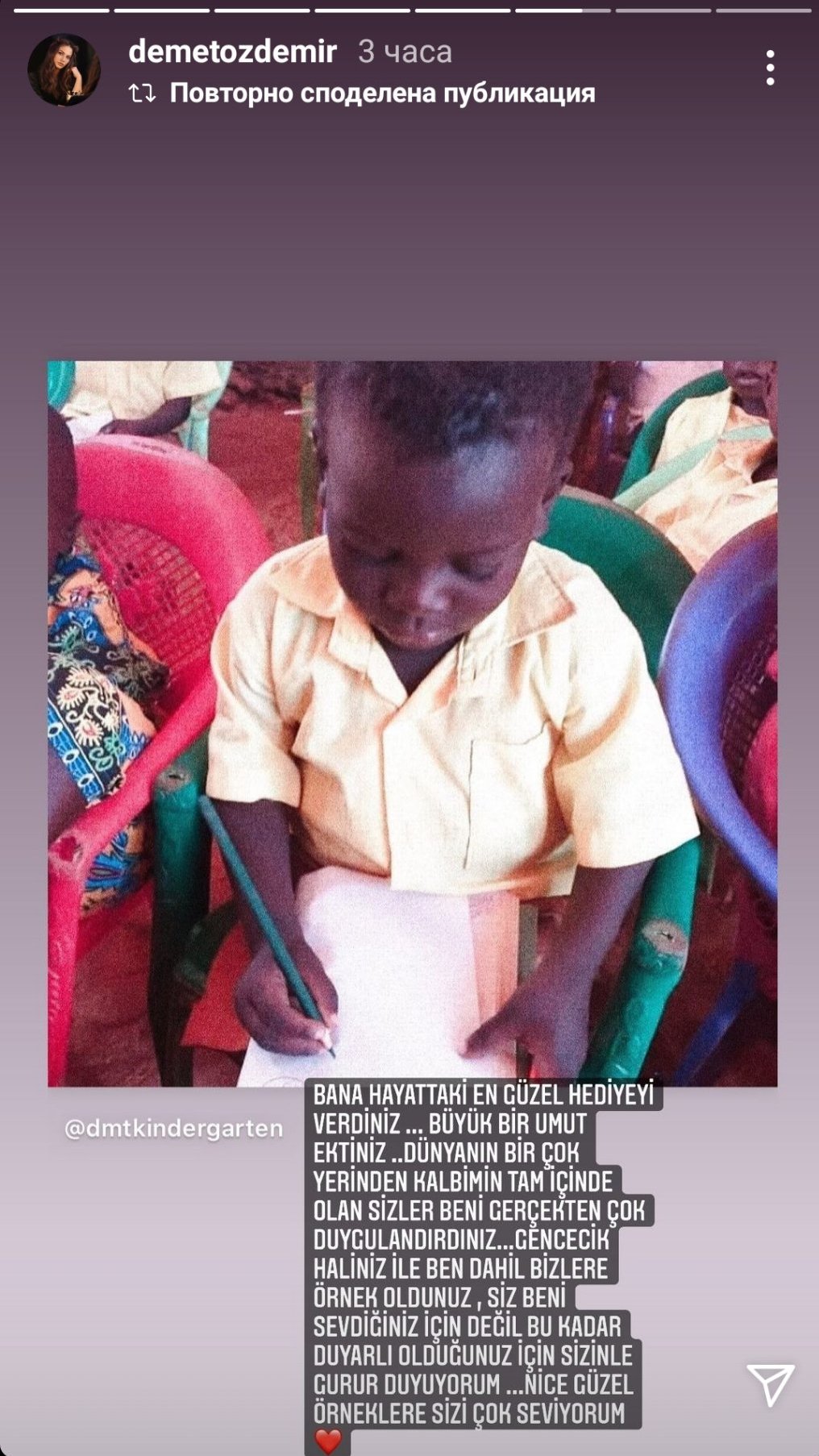 , в който казва, че това е най-хубавият подарък, който е получавала. Изпълнили са я с надежда. Разчувствали са я много. Гордее се с феновете, които са го направили, не защото са я обикнали толкова (че да кръстят училището Демет Йоздемир), а защото макар и много млади, са направили нещо, което може да служи за пример, включително и на нея.
