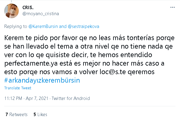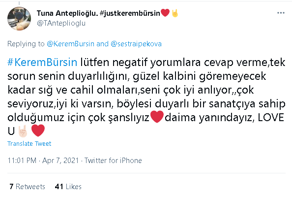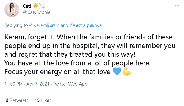 Момичета, и турските фенове не стоят безучастни. Много са се активирали. Толкова много коментари в защита на Керем чета и ми става много приятно. Само отделни индивиди пишат. И веднага под написаното започват нормалните хора да се възмущават. Лекари, интелигентните хора са излезли с официални постове, с които благодарят за смелостта на Керем. Така че той не е сам. Целият свят го подкрепя.