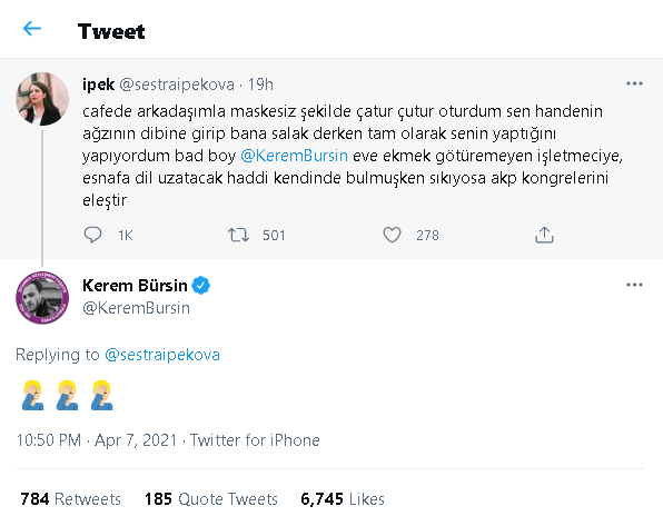 Но Керем много достойно е отговорил. С емотикони на човече плеснало се по челото. Изумен е човека от пълната простотия на тази персона. Е как да не ги нарече "идиоти". То друго определение няма.