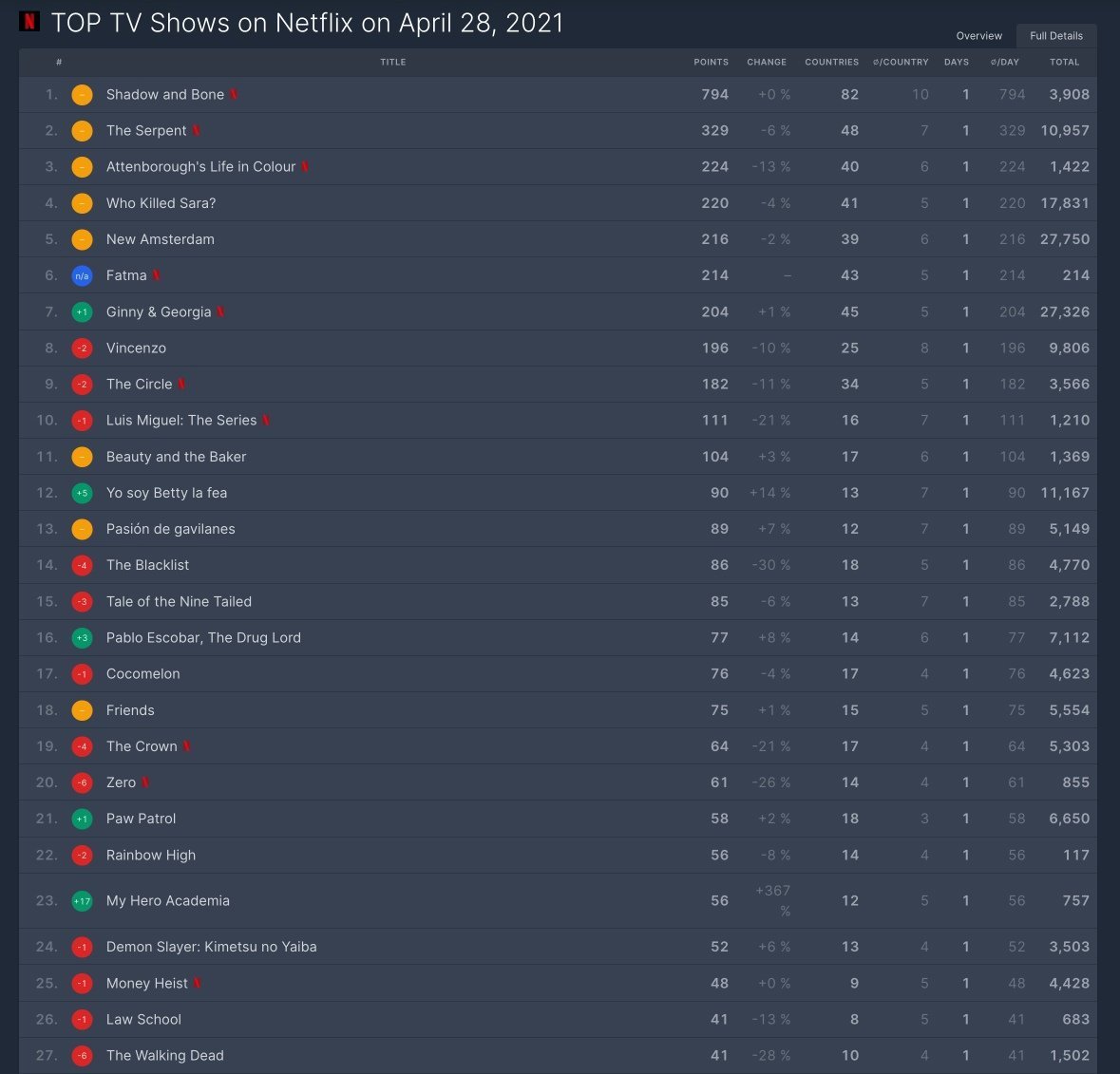 Сериал Фатма, главную роль в котором исполняет Бурджу Бириджик, заинтересовал международного зрителя, дебютировав на 6-м месте среди всех сериалов на Нетфликс. Проект оказался в топе в 43 странах, получив 214 пойнтов в первый день показа. Это второй по успешности дебют проектов производства Турции на платформе (его опередил лишь фильм Бумажные жизни) после появления официальных рейтингов Нетфликс в прошлом году.