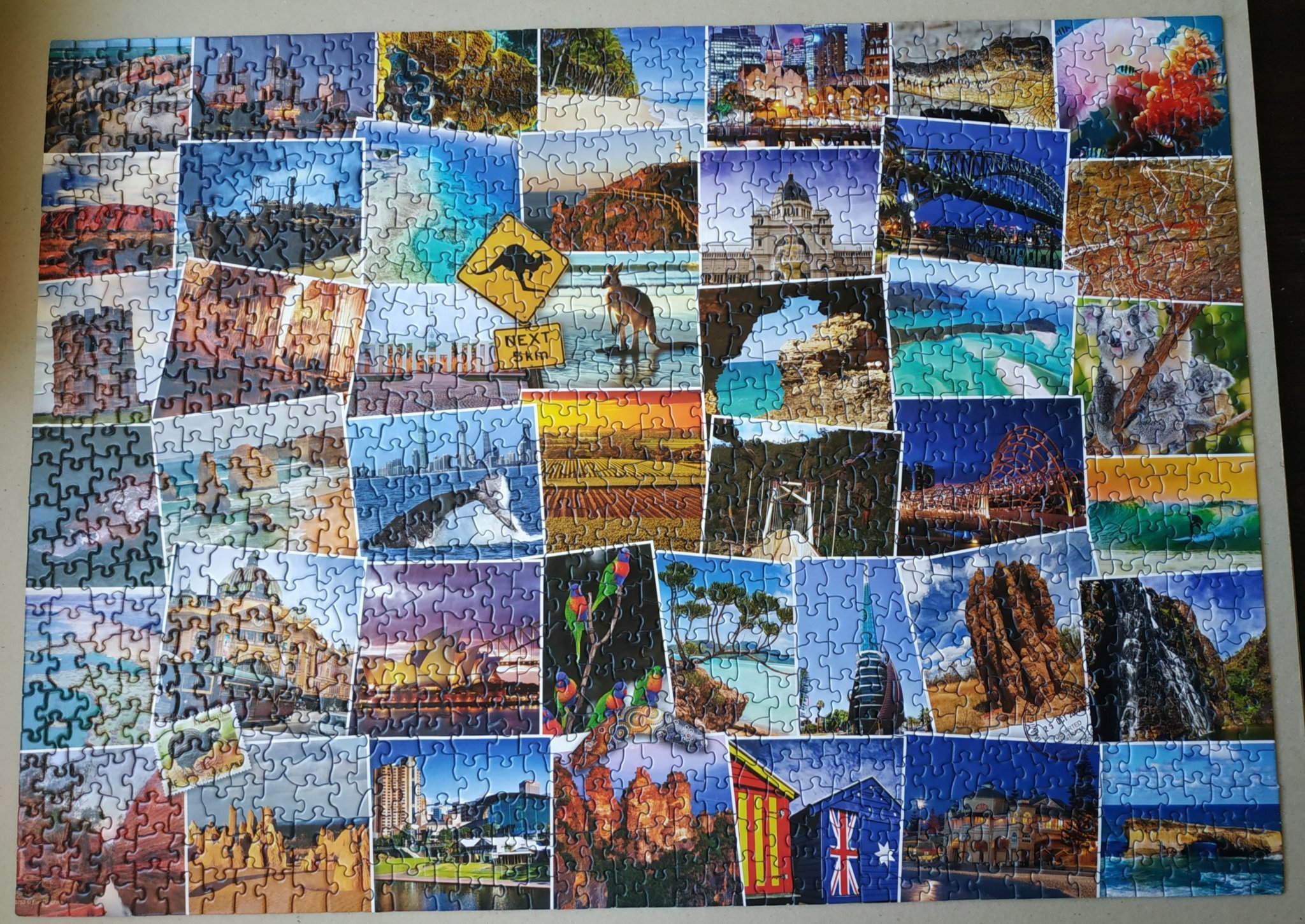 Не, не беше особено трудна за редене картинката, но не ми допадна колаж от множество малки. Не е моят просто. Иначе това е за забележителности в Австралия. Бях сложила в Любими същите на същата марка за САЩ, Канада и Мексико, но се отказах. Заради качеството най-вече. Не е само прахта, а и това, че като ги редиш, не ляга хубаво на масата пъзела, има неравности, на места стои на бабунки. Явно заради това, че парченцата бяха сравнителни малки и със странна форма, при рязането някои са леко огънати.