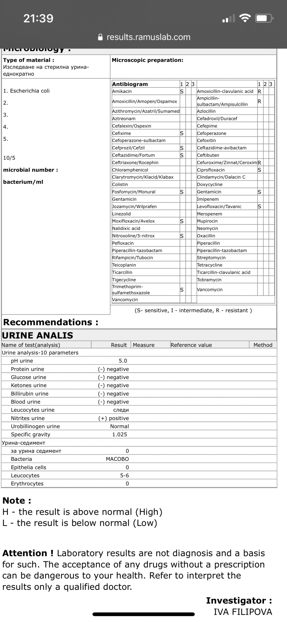 При проблеми с урината се препоръчва изследване на стерилната урина плюс антибиограма, която ще идентифицира причинителя и неговата чувствителност към лечение. Допълнителни тестове могат да включват ехография на пикочния мехур и бъбреците, както и изследвания за хламидия, уреаплазма и микоплазма, тъй като те понякога могат да причинят цистит.