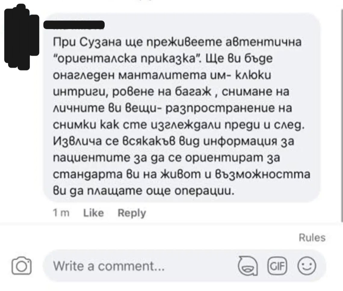 Може да видите реални коментари в английската група за ринопластика. Относно коментара за Сузи - много съм предвидлива и бях сигурна, че ще го изтрият, защото не е за пръв път. Скривам името на дамата от етика.