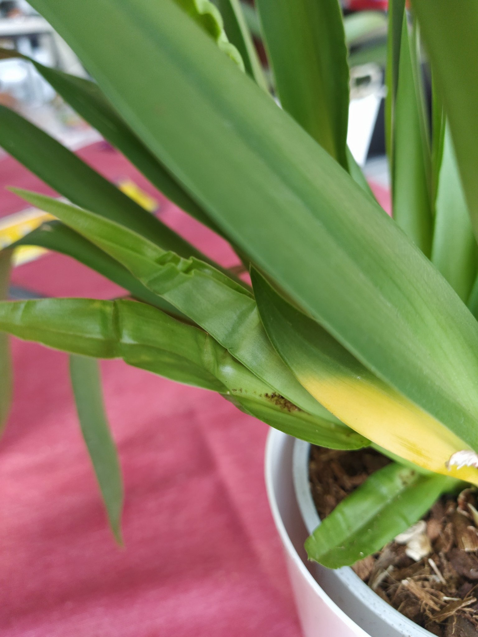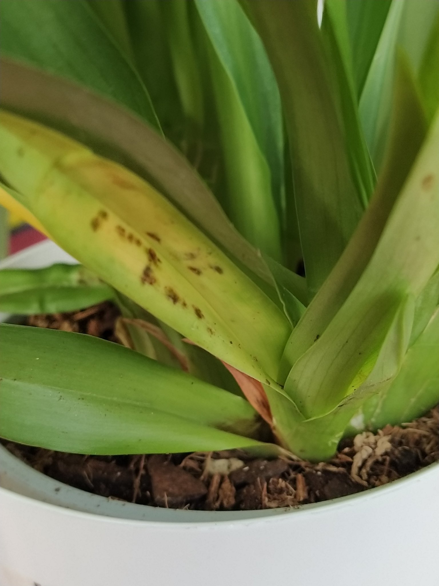 Днес ме обзе желание да разбутам новия ми Милтонопсис, защото вади новите булби на хармоника. Четох, че е възможно липса за на влага или обратното прекалено много влага. Та извадих го корените много добре влага вътре имаше не прекалено много, поливах го с накисване през седем дни. Обаче и едни петна на новите листа излизат