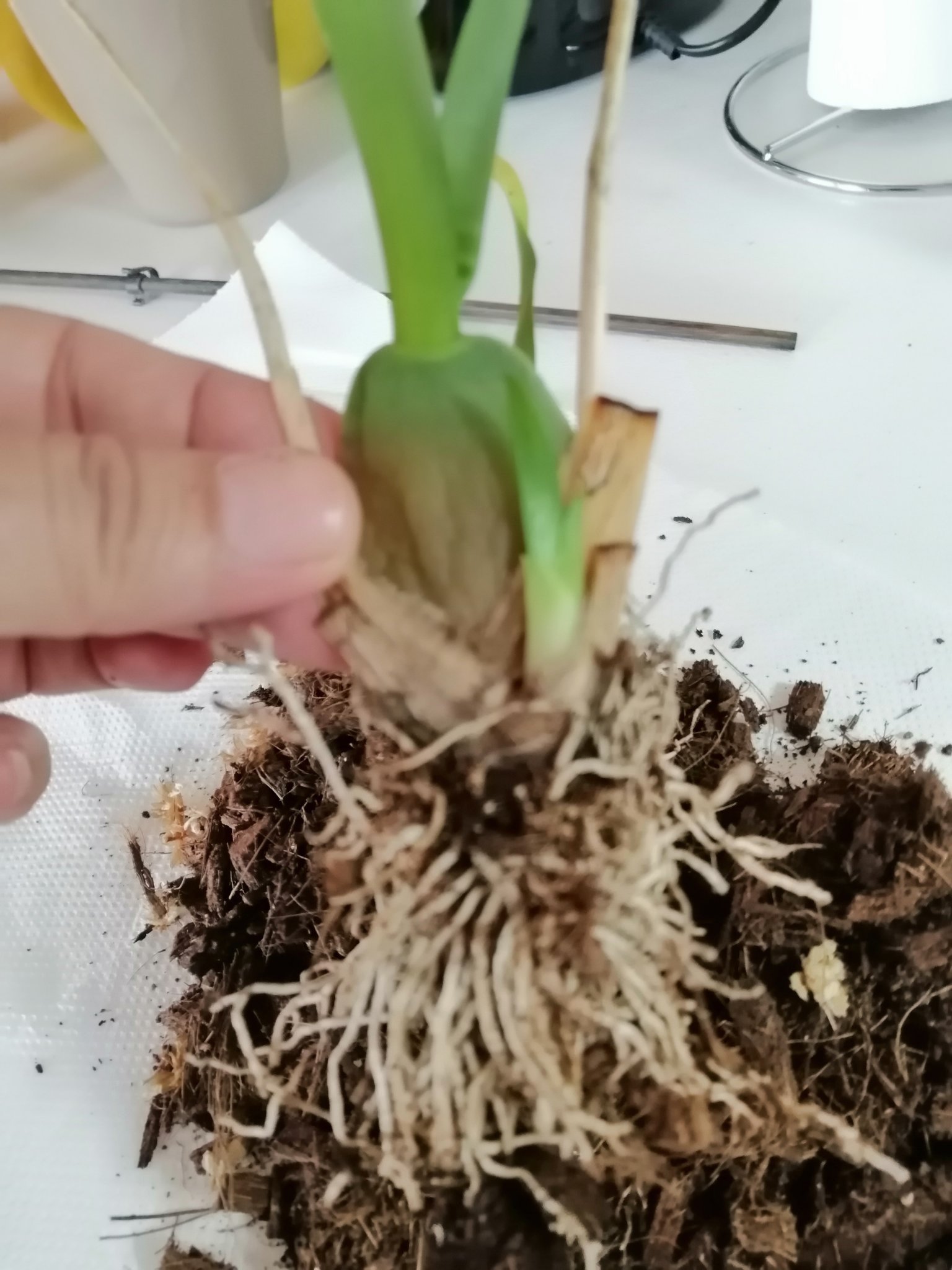 Мини Марка дойде точно в периода на растеж. Имаше няколко нови връхчета на корените и новопоявило се листо. Пресадих го колкото и да ме беше страх да не го повредя. Листото вече порасна и избива друго, има и нови коренчета.