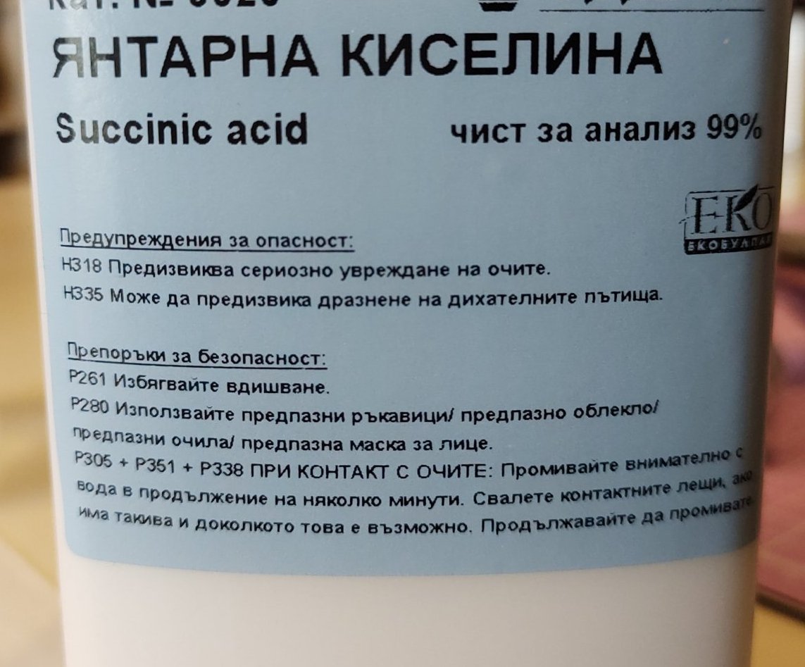 a.n.d.r.e, не е толкова страшна янтарната киселина, не и повече от обикновената лимонена - лимонтозу. Естествено кисалина е, щипе когато е концентрирана и не бива да се пипат очите.