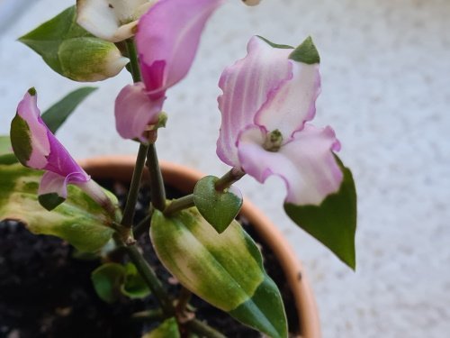 Всъщност в магазина не се усетих кое растение е, името ми беше познато обаче не си го представих как расте, просто ми хареса на вид. После видях че е онова висящото, което аз знам като "странстващия евреин", ама не прилича на висящо в момента. Нищо де, аз вече си търсех висящо за тоя рафт, щях да взимам "висящите сърца", ще видим и дали на традескантията ще й е достатъчно светлината, за да си запази розовото