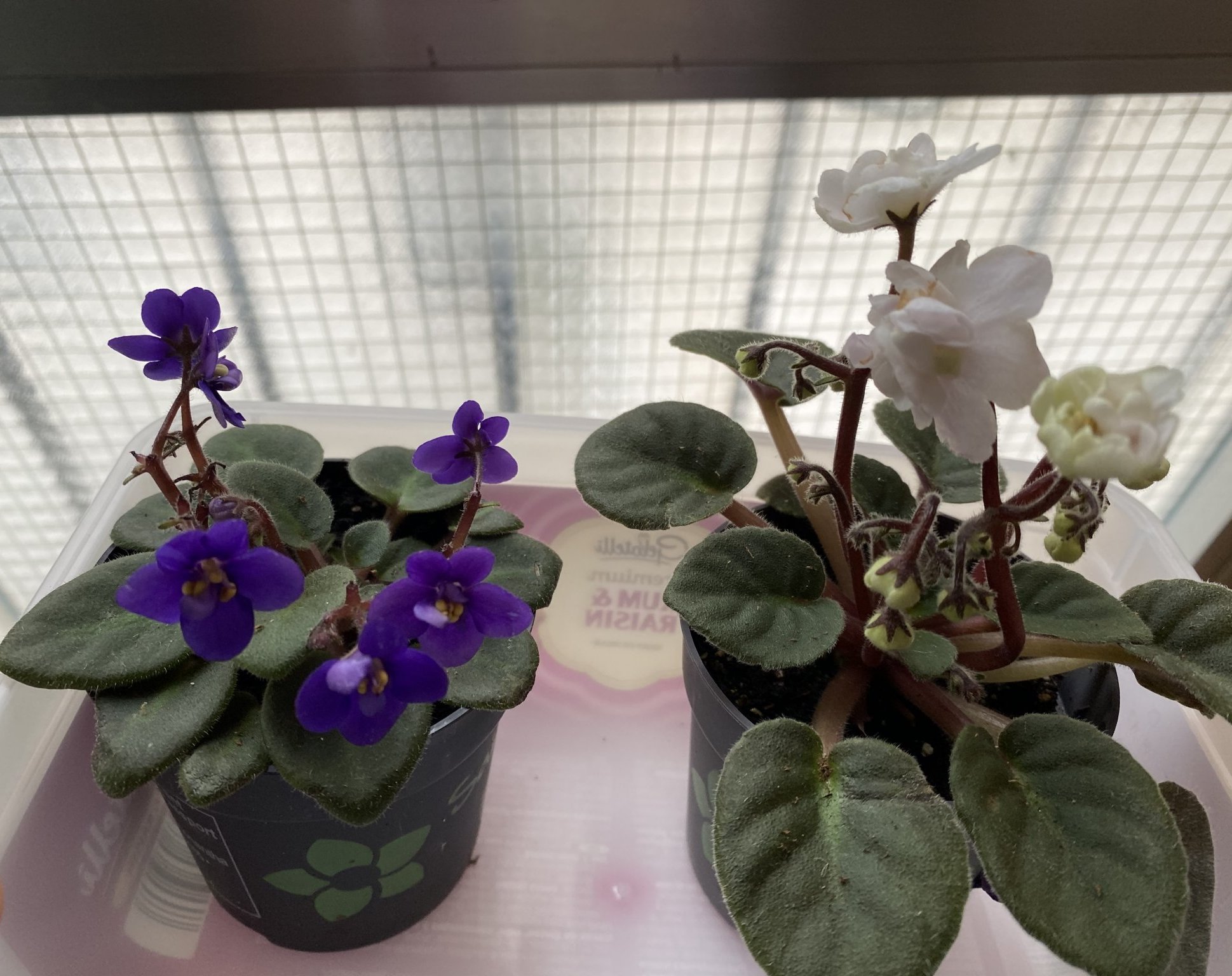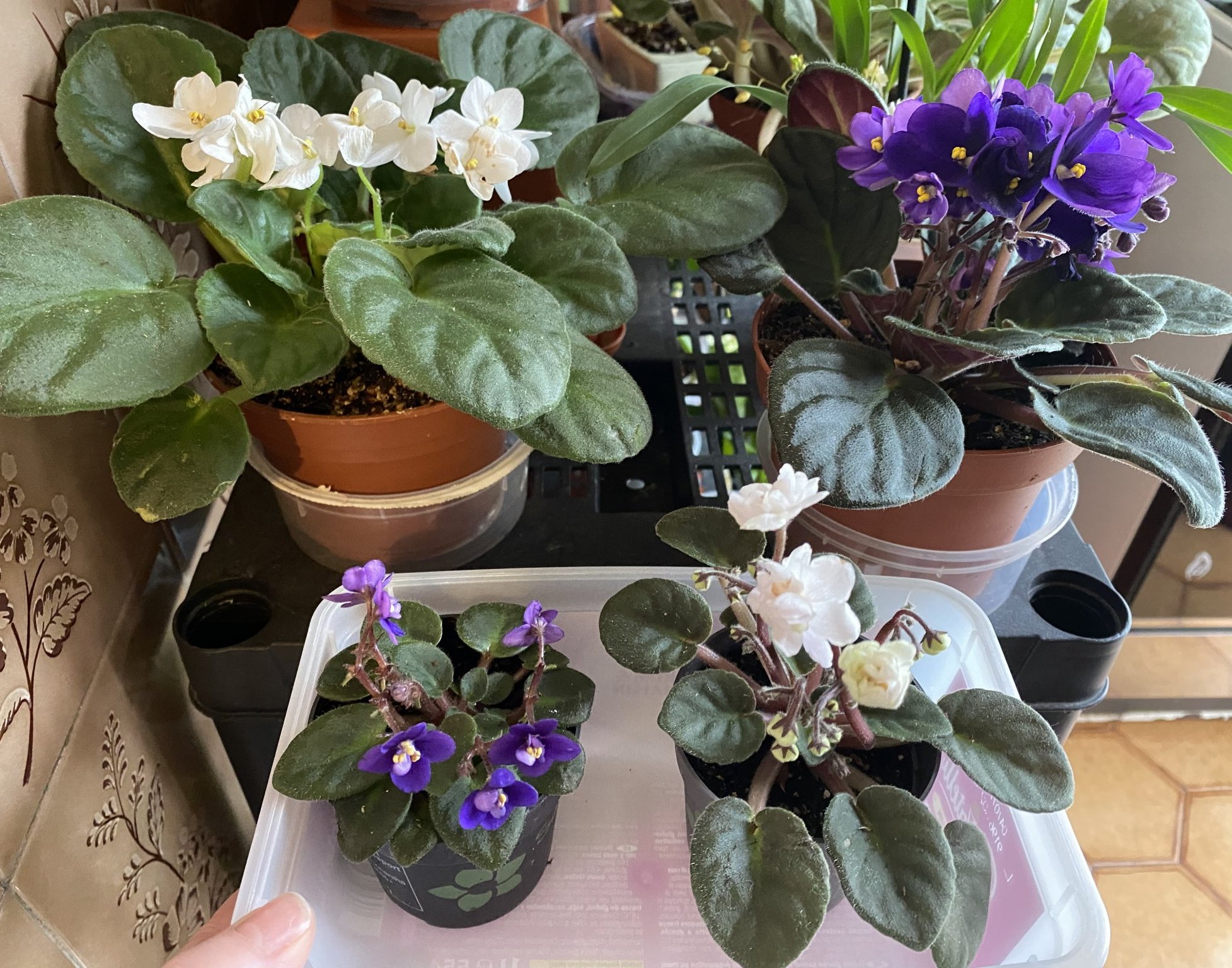 Последните ми придобивки: мини африкански теменужки спасени от явно загиване (оставиха ги седмици без поливане, едвам ги избрах). И за да видите разликата от нормалните: