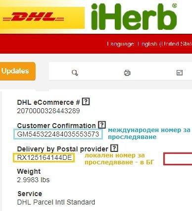 В сайта на iherb -  My Account -> Orders  -  от проследяването на съответната поръчка  -> в сайта на DHL - полето в дясно: