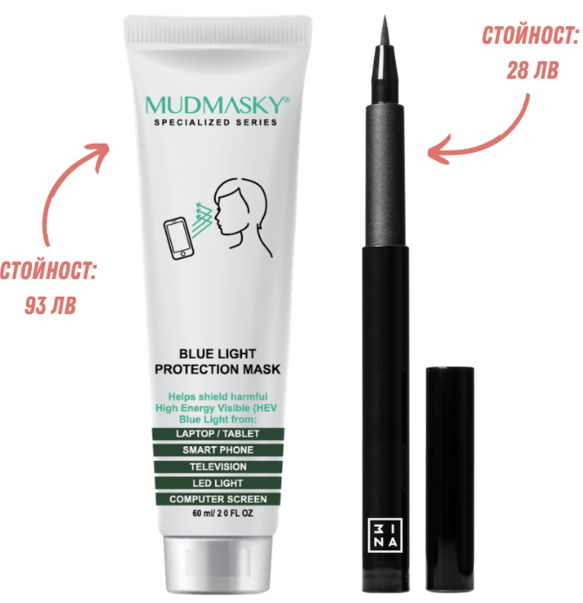 През Май ще откриеш уникалната и супер иновативна Blue Light Protection Mask от Мudmasky на стойност 93 лв., която предпазва кожата от вредната синя (HEV) светлина, излъчвана от екраните на лаптопите, телефоните, таблетите, телевизорите. Ще откриеш и водоустойчивата очна линия The Pen Eyeliner от любимите ни 3INA на стойност 28 лв. Очаквай общо 5 УАУ изненади в BelleBox 'Май' на обща стойност 158 лв. АБОНИРАЙ СЕ