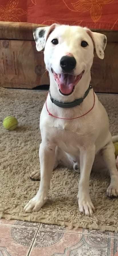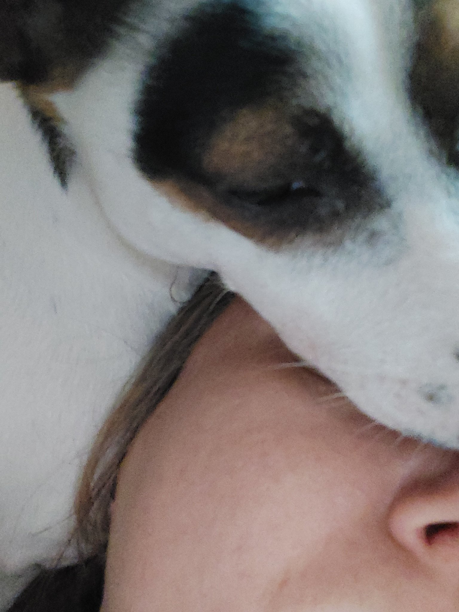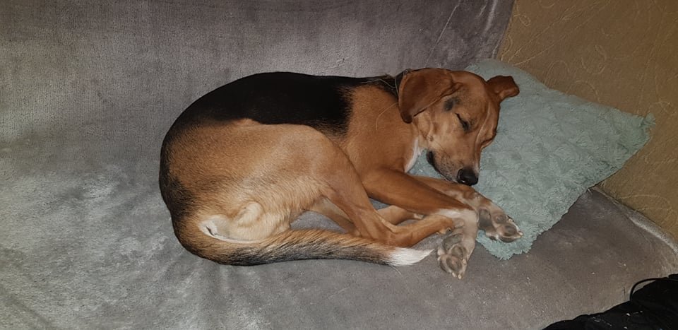 Пък то е един фъстък, на около годинка е, но е дребничко. Казват, че е кръстоска между пинчер и между друго, прилича на някакъв териер, има много готини космати вежди. Ще го снимам, но още е стресирано, може би е бито... С мама и Монка постоянно го милваме, но не излиза от къщичката, освен за манджа и ако.