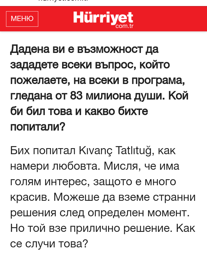 „ Twitch стримера Мустафа Емре Йълдъз, на чиято платформа ежедневно много хора идват да си чатят помежду си и съвместно да си създават развлекателно съдържание на живо, днес беше гост Ферит Омероулу, обозревател на Hurriyet. Когато журналиста го попита : „Ако би могъл да зададеш въпрос на когото и да било в програма, която се гледа от 83 милиона души, на кого и какъв въпрос би му задал?“ Йълдъз отговори, че би искал да зададе въпрос на Къванч Татлъту: „Как намерихте любовта?“