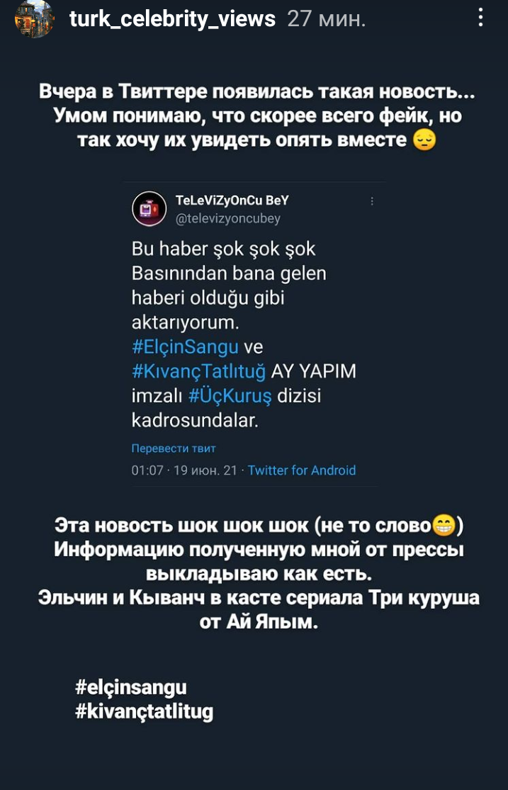 ⚡Според журналиста на изданието Hurriyet Мехмет Юстундаг, Чаатай Улусой и Къванч Т., които са приятели от много години, сега са станали бизнес партньори. Актьорите закупиха 10 декара лозе земя в Тракия (Румелия), където ще произвеждат собствени вина. Изглежда, че модата за лозарството, която е широко разпространена сред холивудските звезди (сред винарите Дейвид Бекъм, Брад Пит, Джони Деп и много други), е достигнала до турски знаменитости.