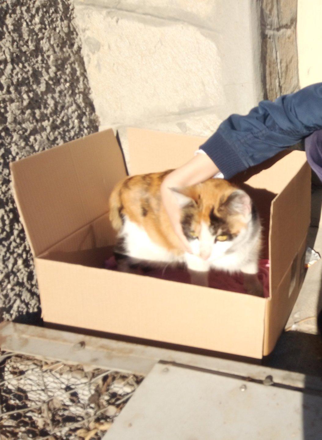 Оф, и аз се влюбих в едно улично коте, което цъфна наскоро в квартала. По принцип всяка котка ме умилява и ми се ще да я прибера, храним сигурно 10, обаче това някак ми бръкна в душата, все го мисля. Хипер дружелюбно, не се пази изобщо от никого. Точно до един зоомагазин е паркирано, има и плод-зеленчук в съседство и хората там го хранят, сипват му вода. Бяха му сложили в една закътана ниша парче картон, застлано с някакъв плат и то милото само на него седеше. Вчера му занесох кашон, наместих постелката вътре, то веднага се намърда Laughing  Следобед като се прибираме с малкия спеше на кравай вътре. Храним го, галим го, то се размазва от кеф. Сладур абсолютен, вечер се наместваме с Кетя в леглото на топло, а аз го мисля това пухче къде спи самичко навън. В непосредствена близост има няколко котешки компании, които са дружелюбни към новодошли, но не съм го виждала все още да общува с тях, общо взето не се отдалечава от кашона си. Та тъй... Ето го и него: