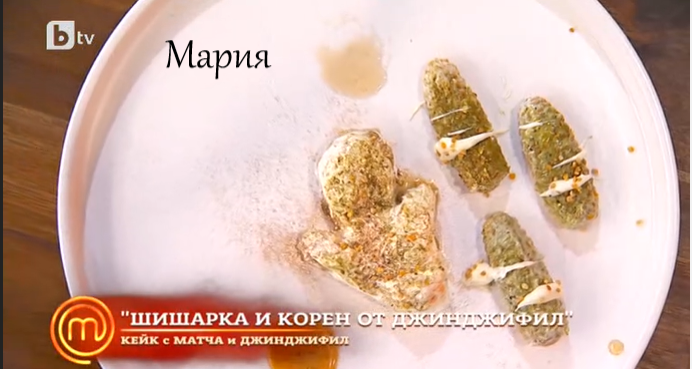 Мария обяснява какво ще прави: дИсерт с джинджифил върху джинжифил, между тях - джинджифил, на джинджифилова основа, поръсени с джинджифил и поднесени върху джинджифилов поднос.