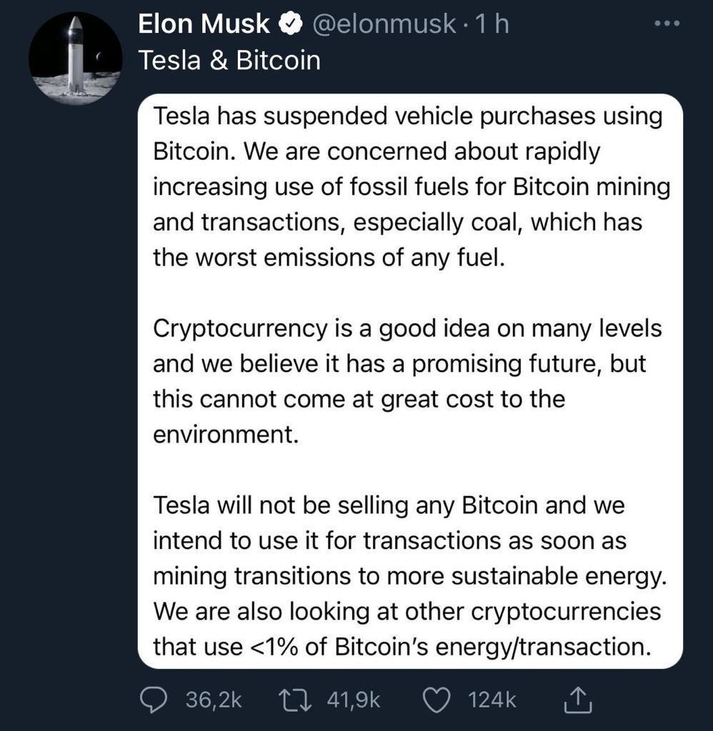 Ето защо всичко пада. Мъск не се кефи на биткойн вече, защото не е особено еко копаенето му и не пасва на визията на Тесла.