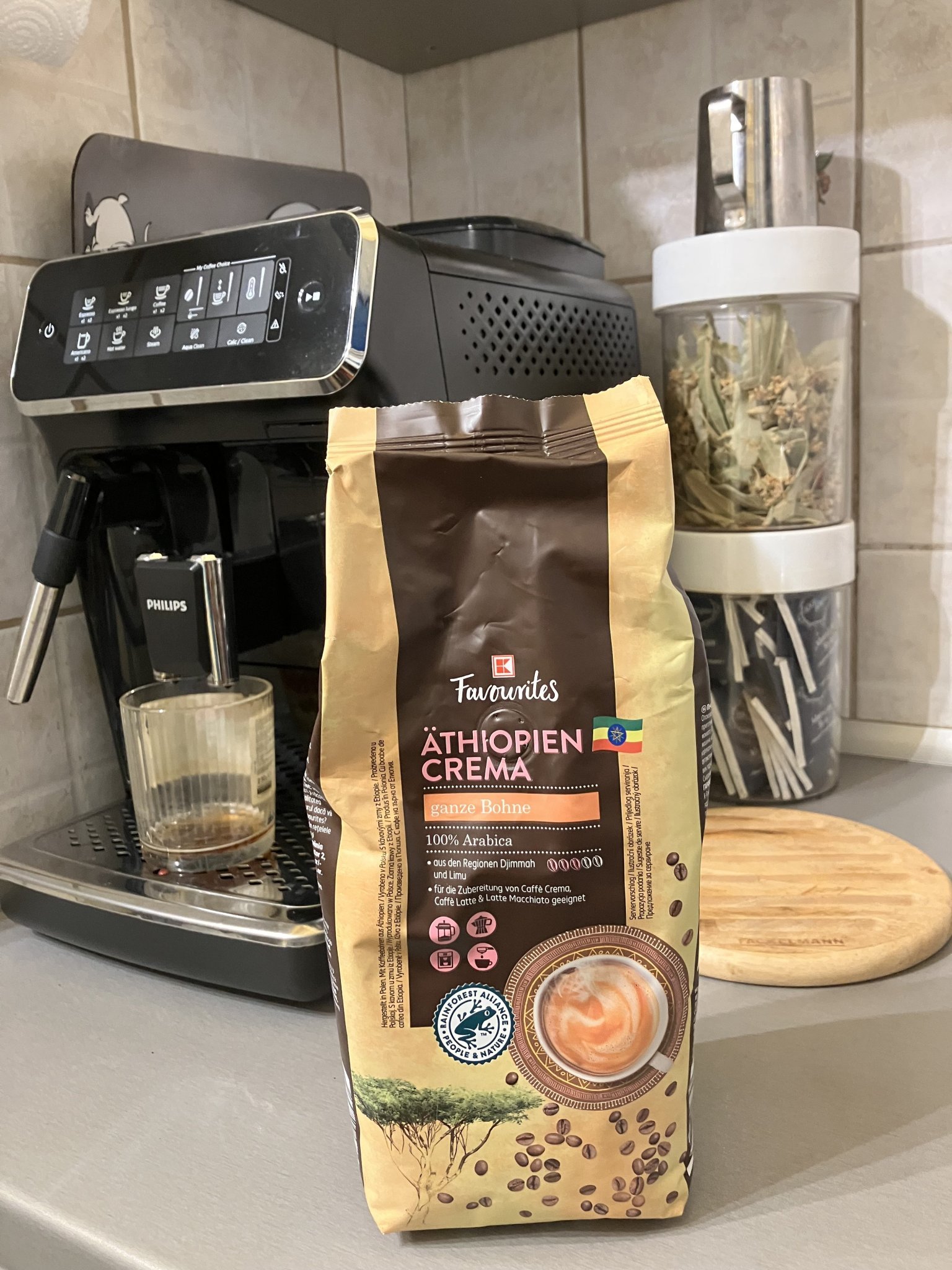 Скоро намерих в Кауфланд тяхна марка кафе на добра цена (30 лв./кг.) - етиопско и бразилско (и двете са 100% арабика). На настройка най-ситно мелене на мелачката на автомата (Philips) кафето е доста прилично.