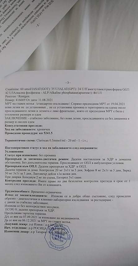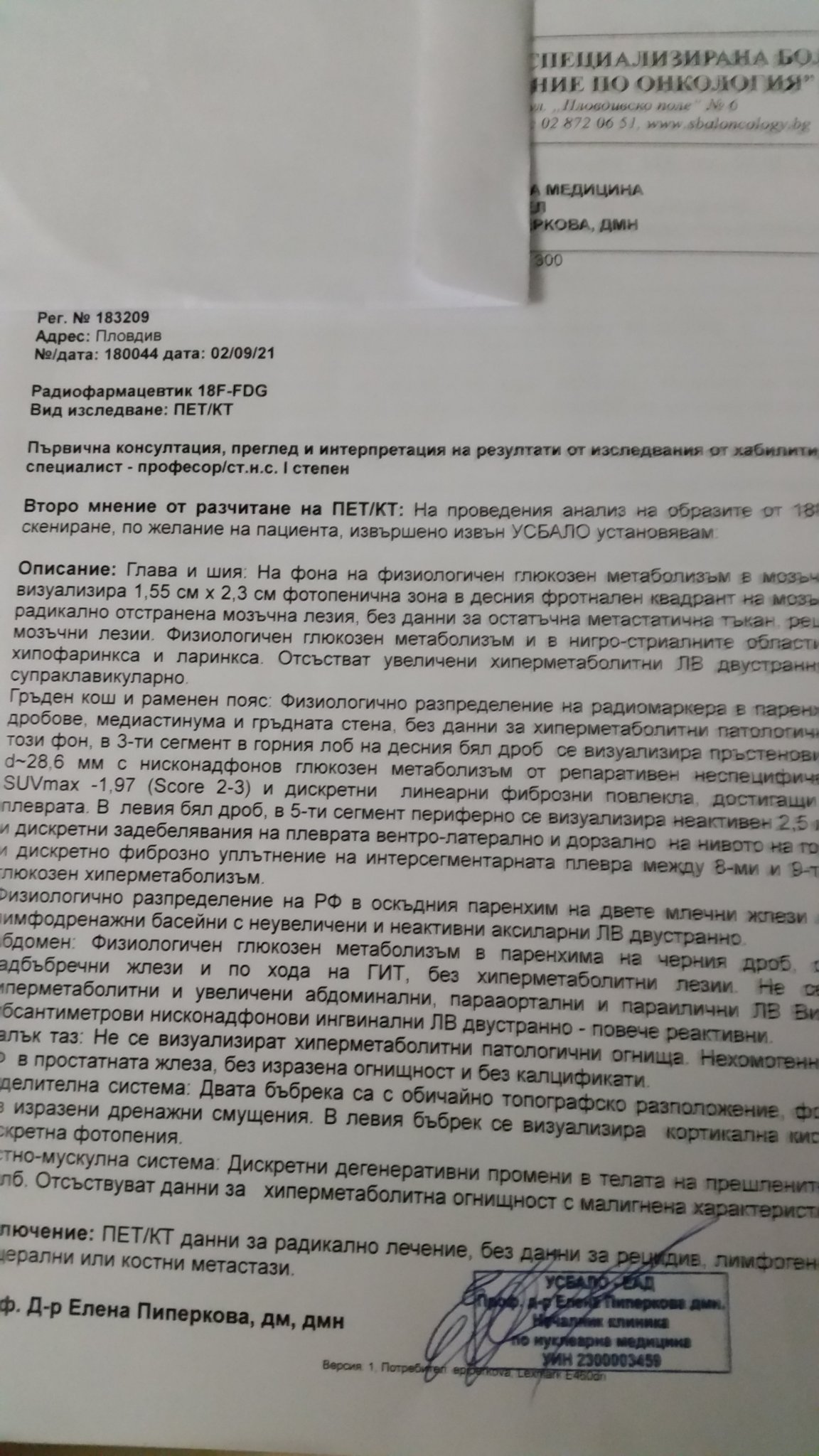 Проф. ПиперковА потвърди заключението от ПЕТ/CT от Токуда, като малко по-подробно е описанието.Уморих се от чакане (до 17: 30) и забравих да я питам за количеството РФ, а и тя май беше поуморена. Питах възможно ли е да се отдиференцира пневмонит,  отговори , че ако е било това е отшумяващ в момента на скенера и не може да се различи от друго възпаление. За малките размери и натрупването на РФ, каза че техния софтуер хваща и по-малки метаболитно активни лезии.Питах и за една аномалия ,която виждам на всички СТ-та, но никога не са описвани.Имах предположения , че са в абдоминалната част на аортата и илиачните артерии и са калцификати, гледа още веднъж СТ изображенията ( на тях се виждат) и потвърди предположението ми, като каза , че са малки засега.