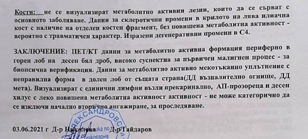 Материалът от белия дроб се получава чрез бронхоскопия, като процедурата се извършва под упойка. В случаи на периферно разположен тумор, като този във вторичния лоб на десния бял дроб, вероятно ще се използва видео-асистирана торакална хирургия (VATS) за получаване на материал за хистологично изследване.