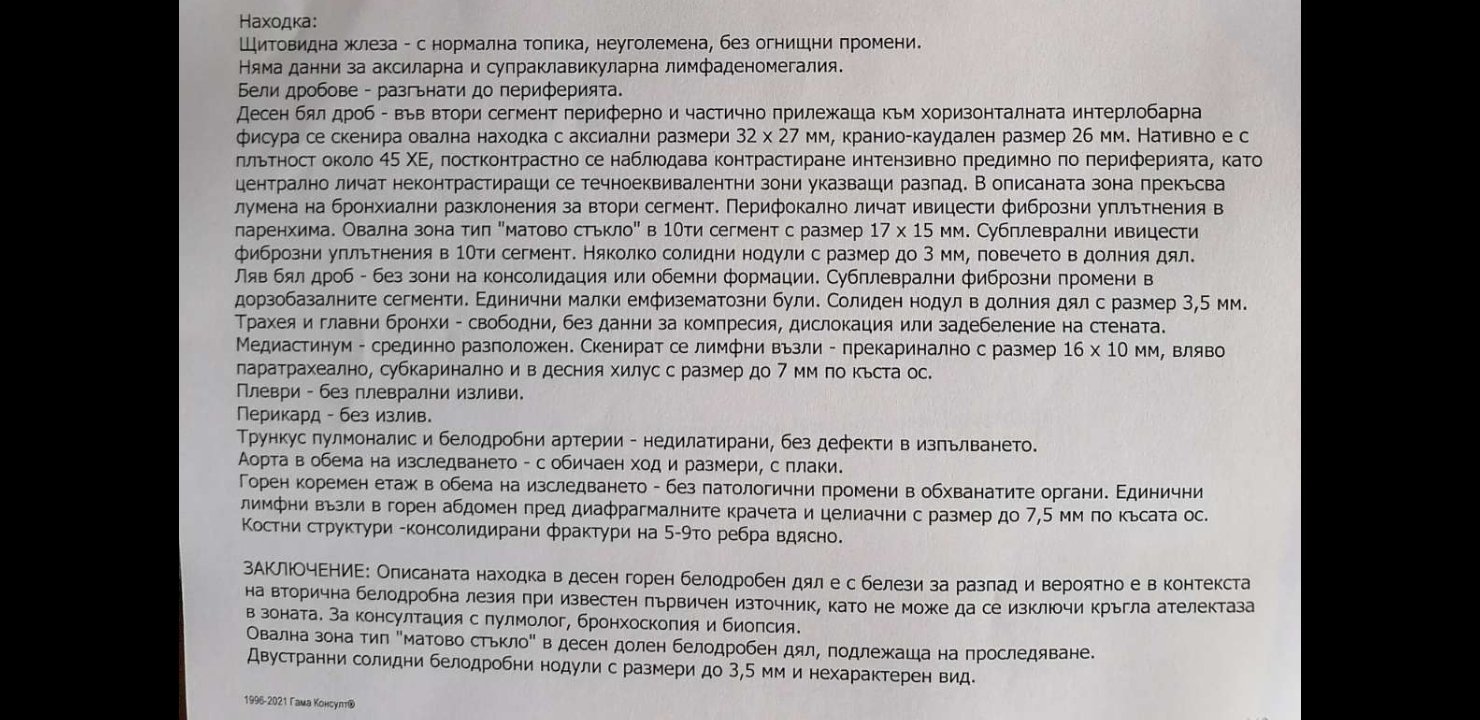 Материалът от белия дроб се получава чрез бронхоскопия, като процедурата се извършва под упойка. В случаи на периферно разположен тумор, като този във вторичния лоб на десния бял дроб, вероятно ще се използва видео-асистирана торакална хирургия (VATS) за получаване на материал за хистологично изследване.
