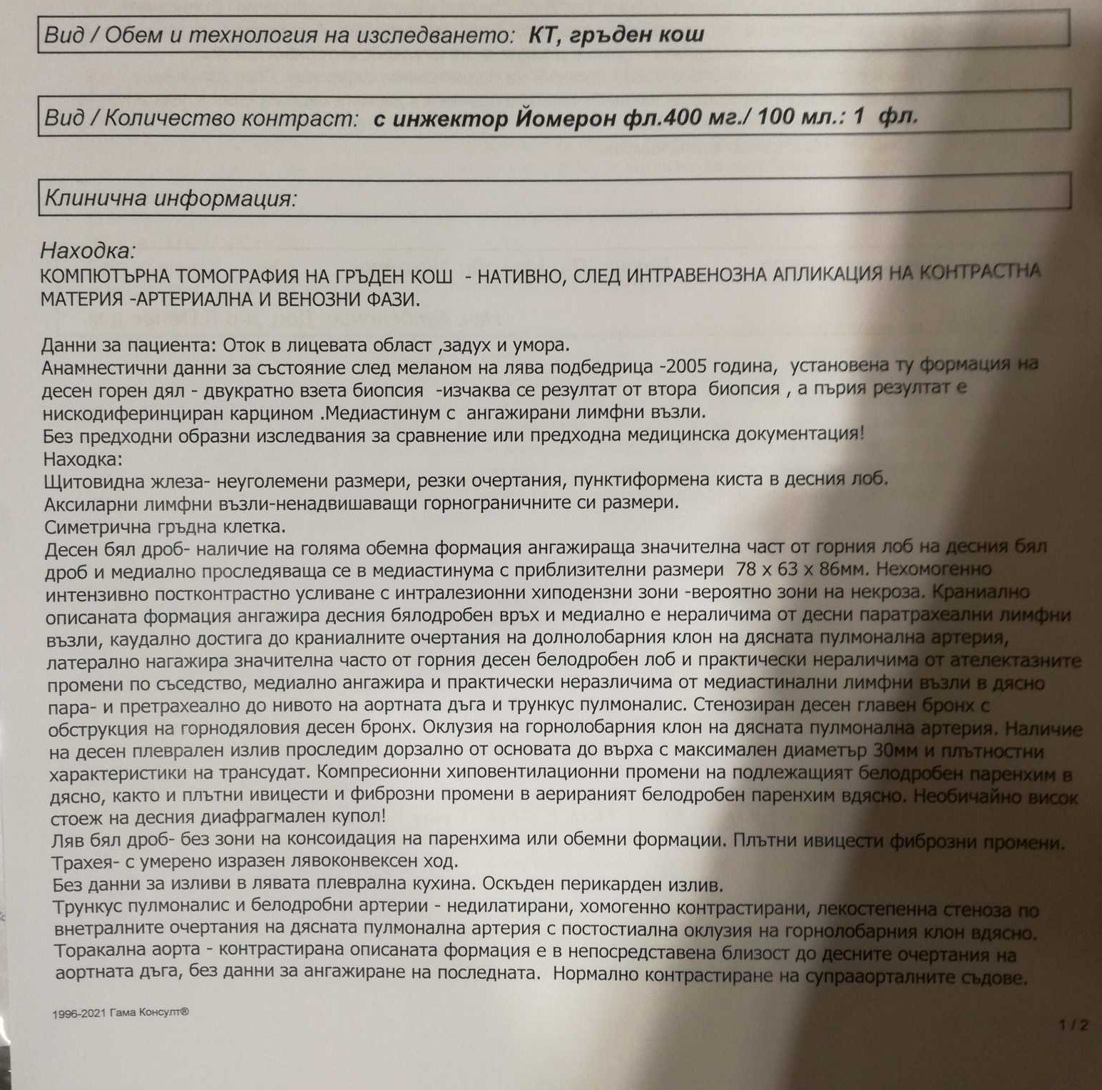 Още един месец по-късно отидохме в Пирогов, където най-после й обърнаха някакво внимание и направиха CT на корем. Намериха, уж, нещо за операция в червата, й я прехвърлиха от вътрешни болести към хирургията. Там направиха и CT на гръден кош, и намериха ТУ формация в бял дроб. Уж била малка. Направиха биопсия на лимфни възли около дроба (без резултат) и я пратиха в белодробната. Там направиха биопсия и, след още няколко седмици излязоха резултати - метастаза в бял дроб от меланома. Ориентирахме се директно към др. Дудов и Сити Клиник, там искаха CT на място, и след резултатите (които изведнъж изкараха образувания 80х60х85мм и лезии навсякъде, след "уж" малки находки от разчитането в Пирогов/Белодробната) онкокомисията отказа да я приеме. Уж платено разглеждане на документи и епикризи, но без много обяснения.